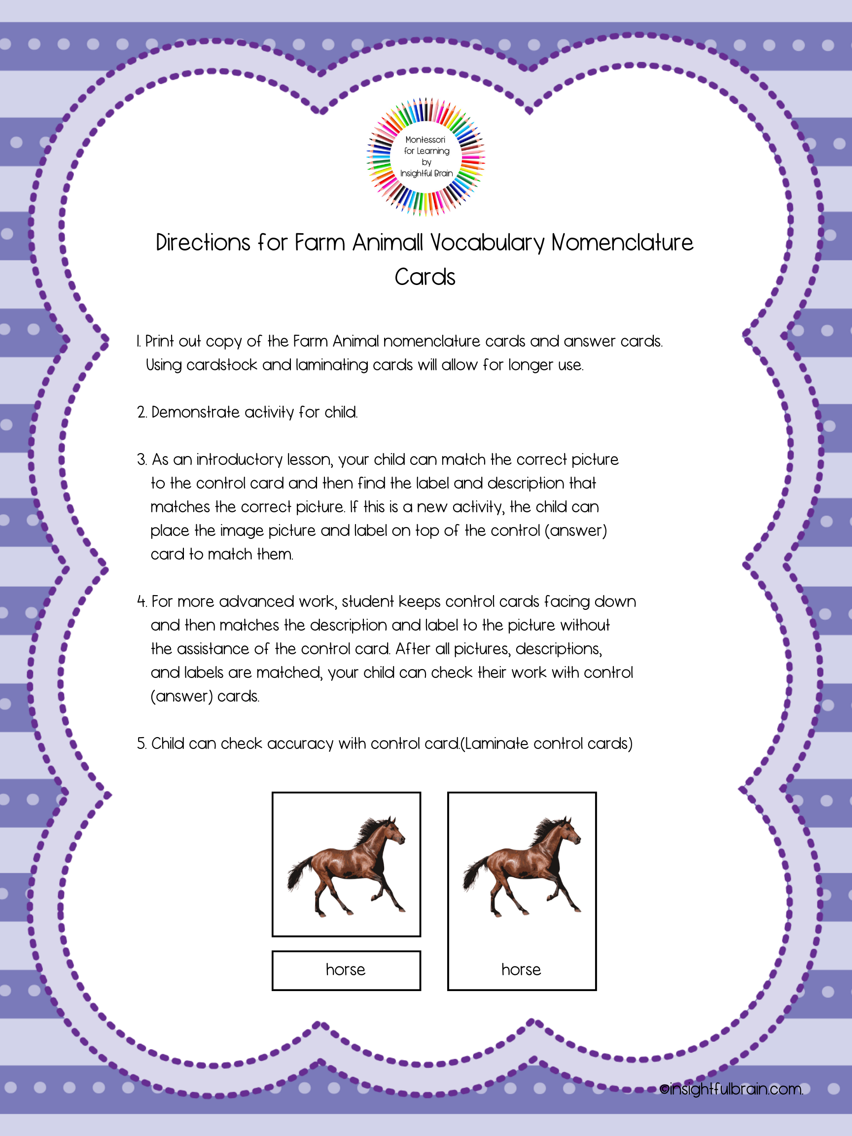 The set includes: 12 farm animal vocabulary cards, 12 control cards, and instructions.