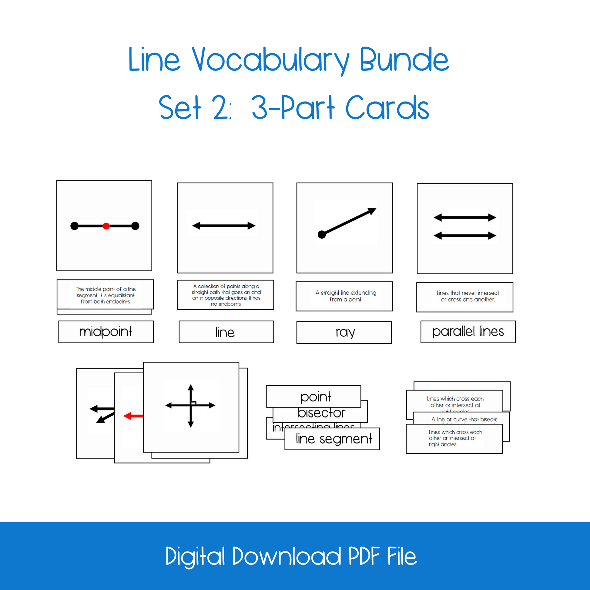 2. Line Vocabulary 3-Part Cards: 10 images cards, 10 labels, and 10 definitions plus 10 control cards for child self-checking.