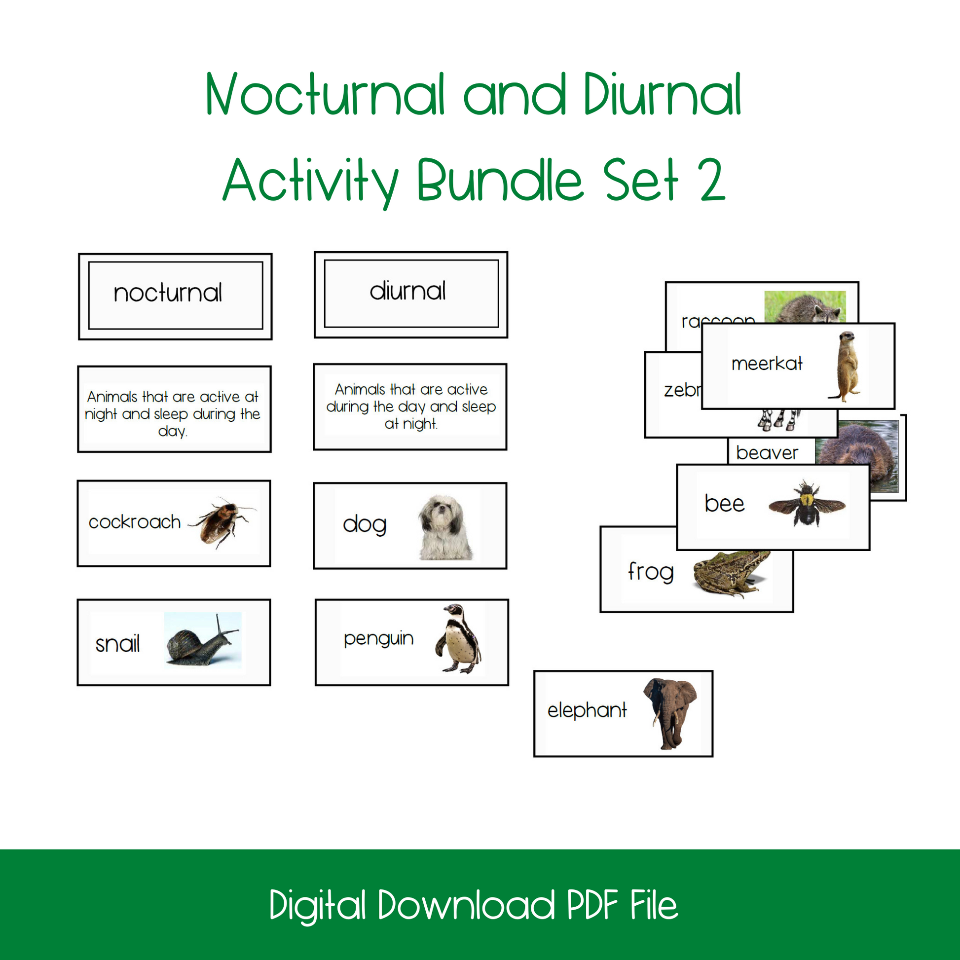 - 2 category labeling cards of Nocturnal and Diurnal (in each set). Four total included in bundle.