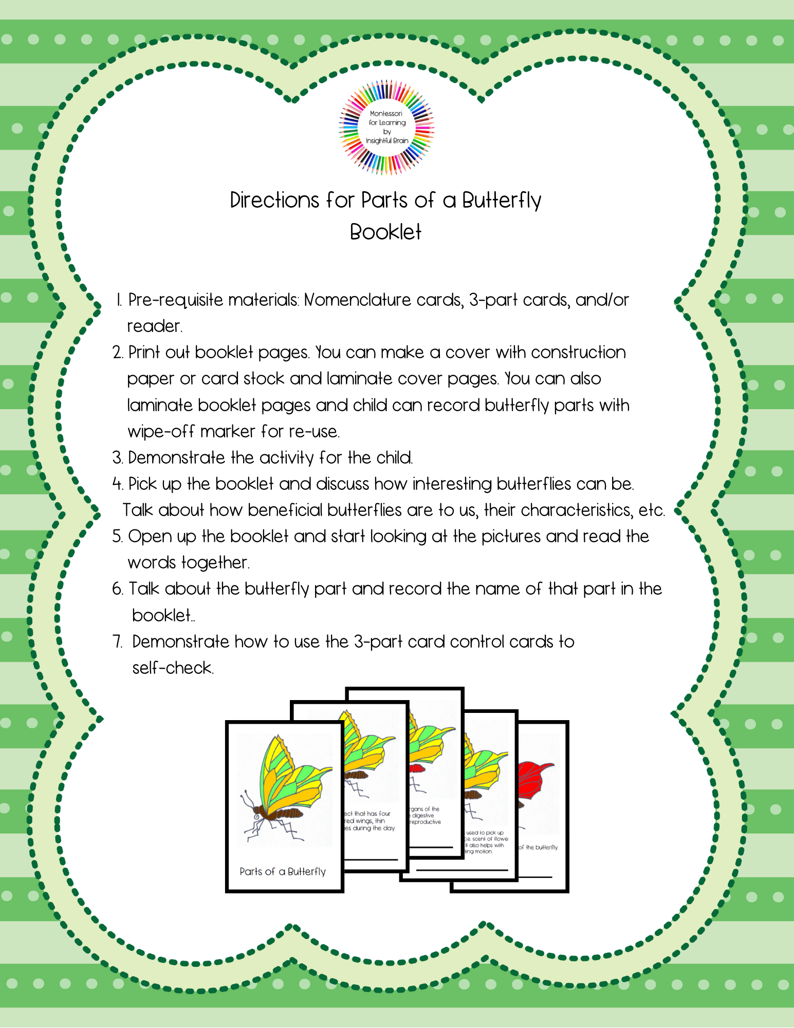 2. Parts of a Butterfly 3-Part cards (and control cards):Â 10Â picture cards, 10 labels, 10 definition cards, 10 control cards for self-checking.