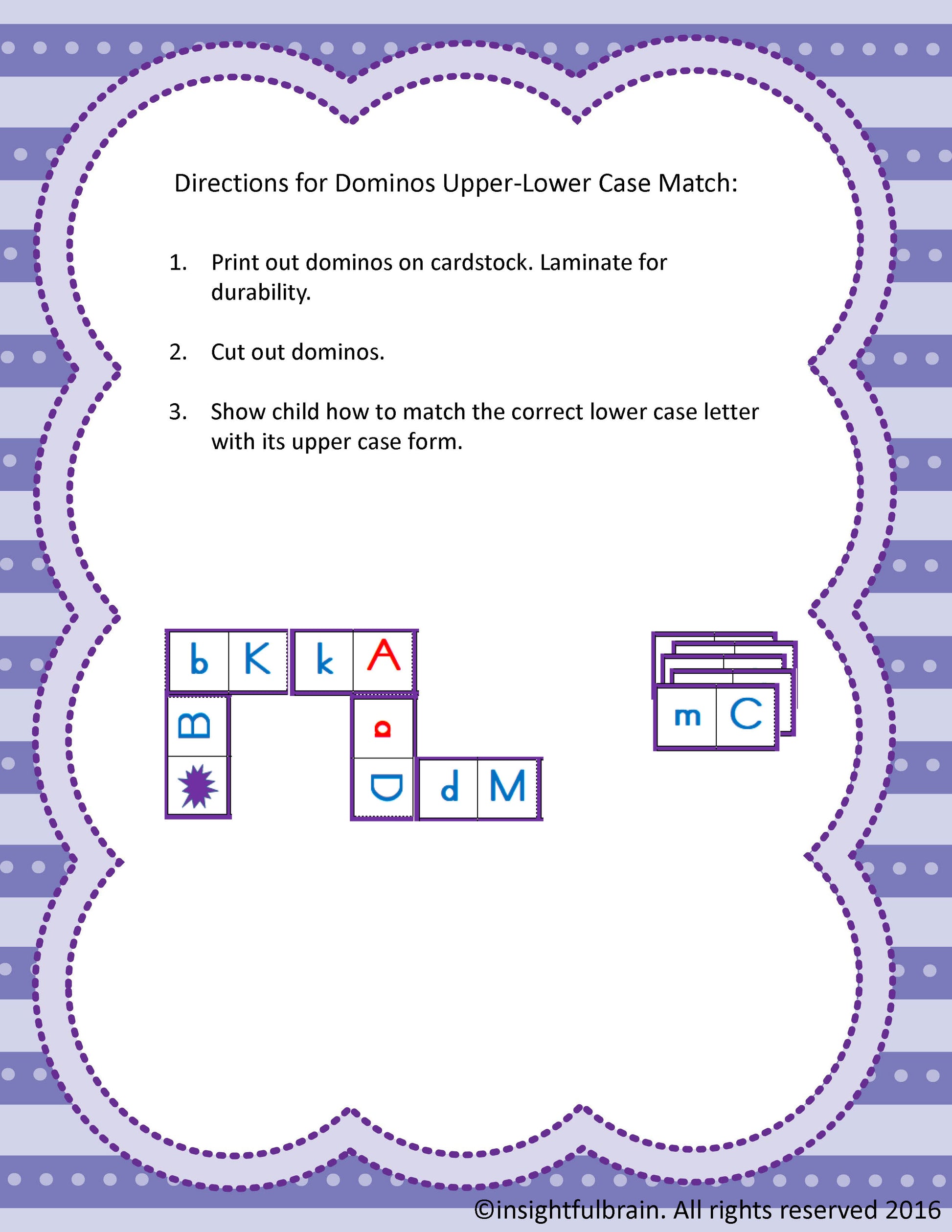 3. Show child how to find beginning domino card (has a starburst shape on the left side of card) and then how to match the lower case letter form with its upper case match.