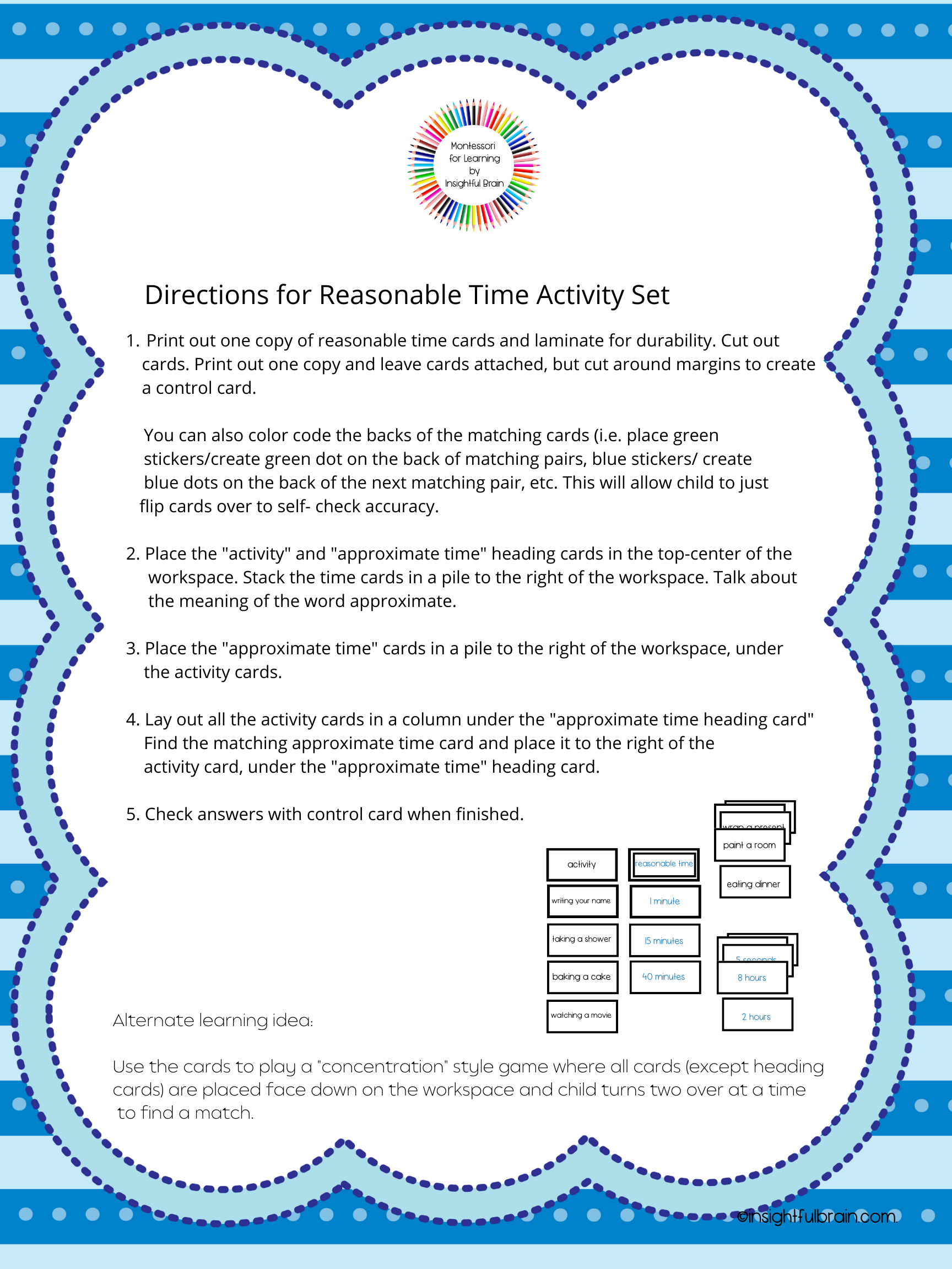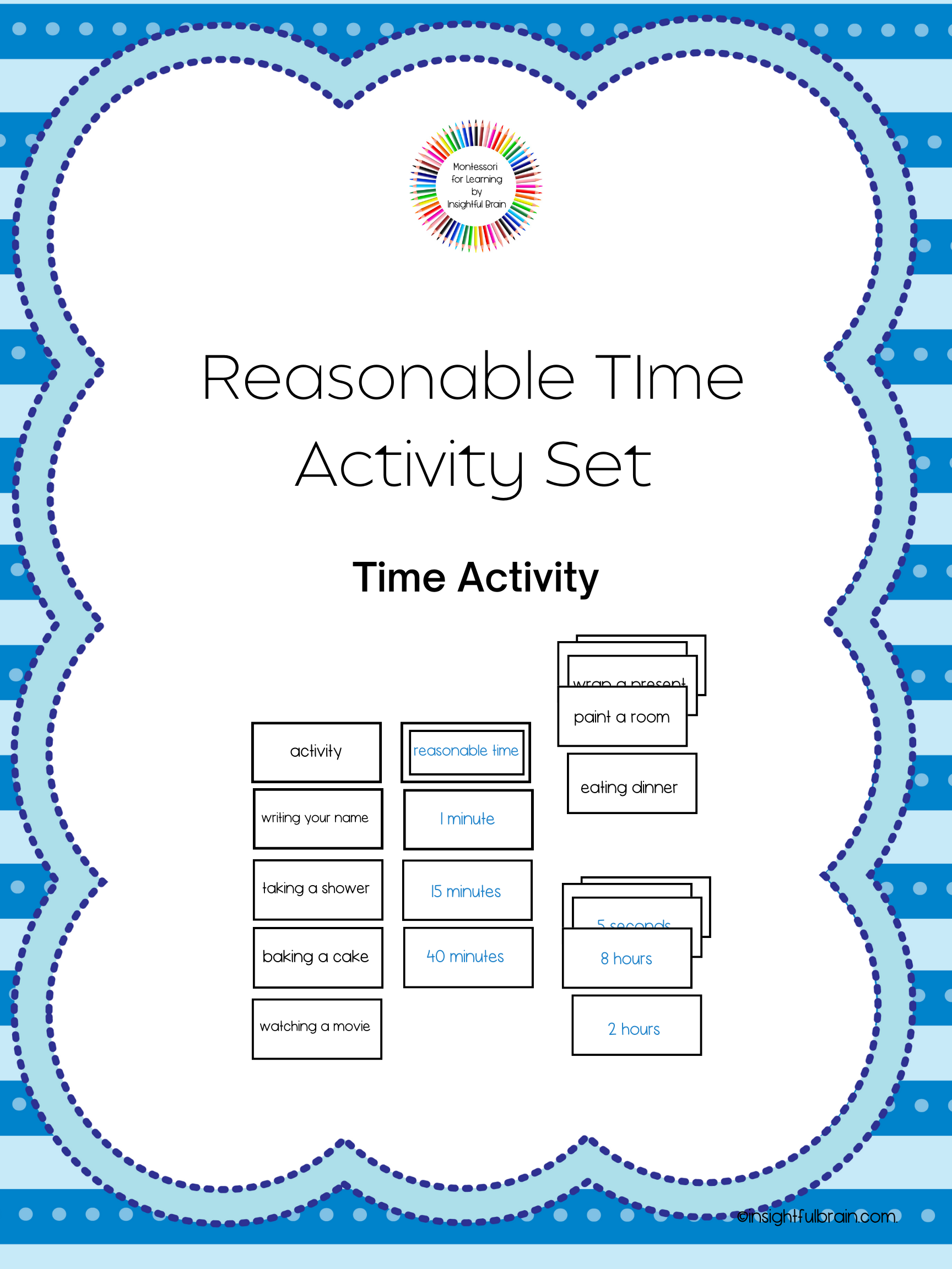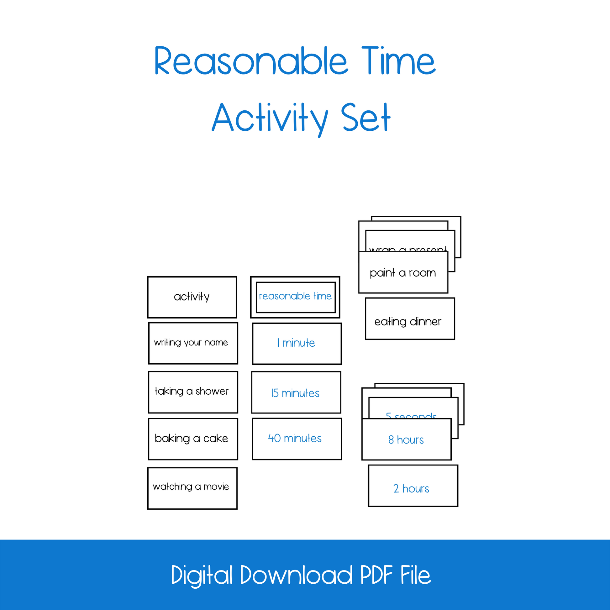 The reasonable time card set helps children to understanding how to judge the “reasonable” time for an activity. This deepens the child's understanding of the abstract concept of time.