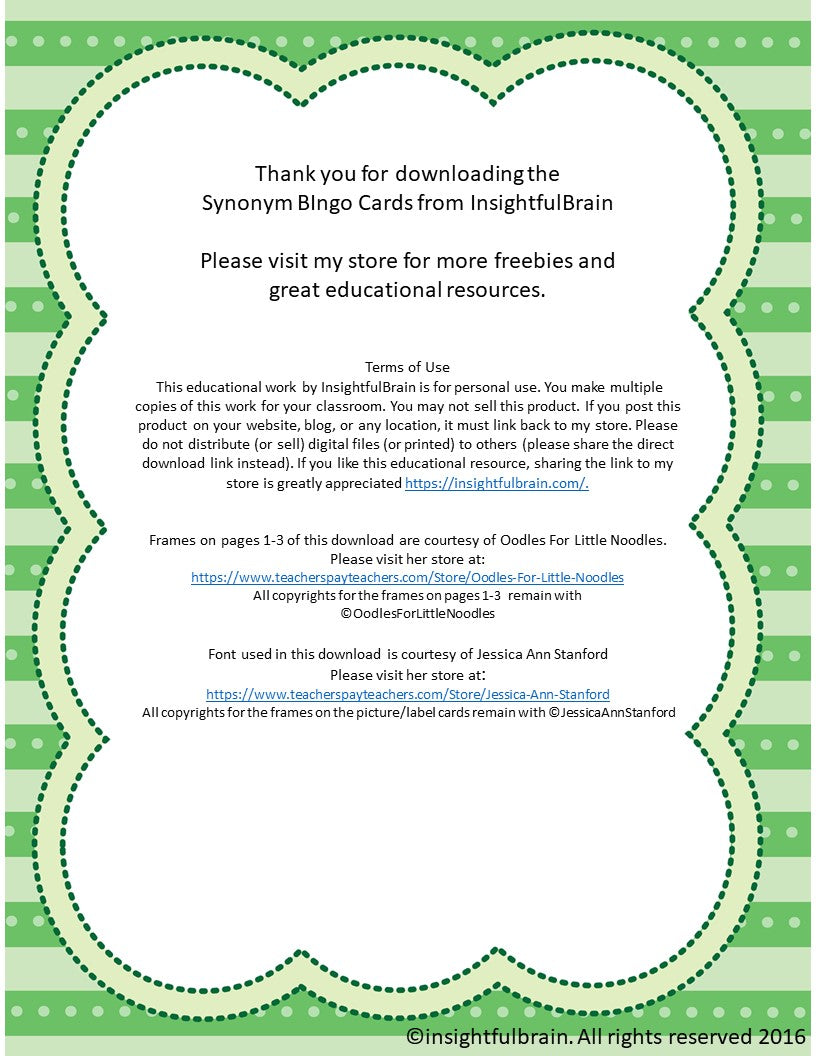 1. 2 sets of Synonymn Bingo Cards (Each set has 30 cards)