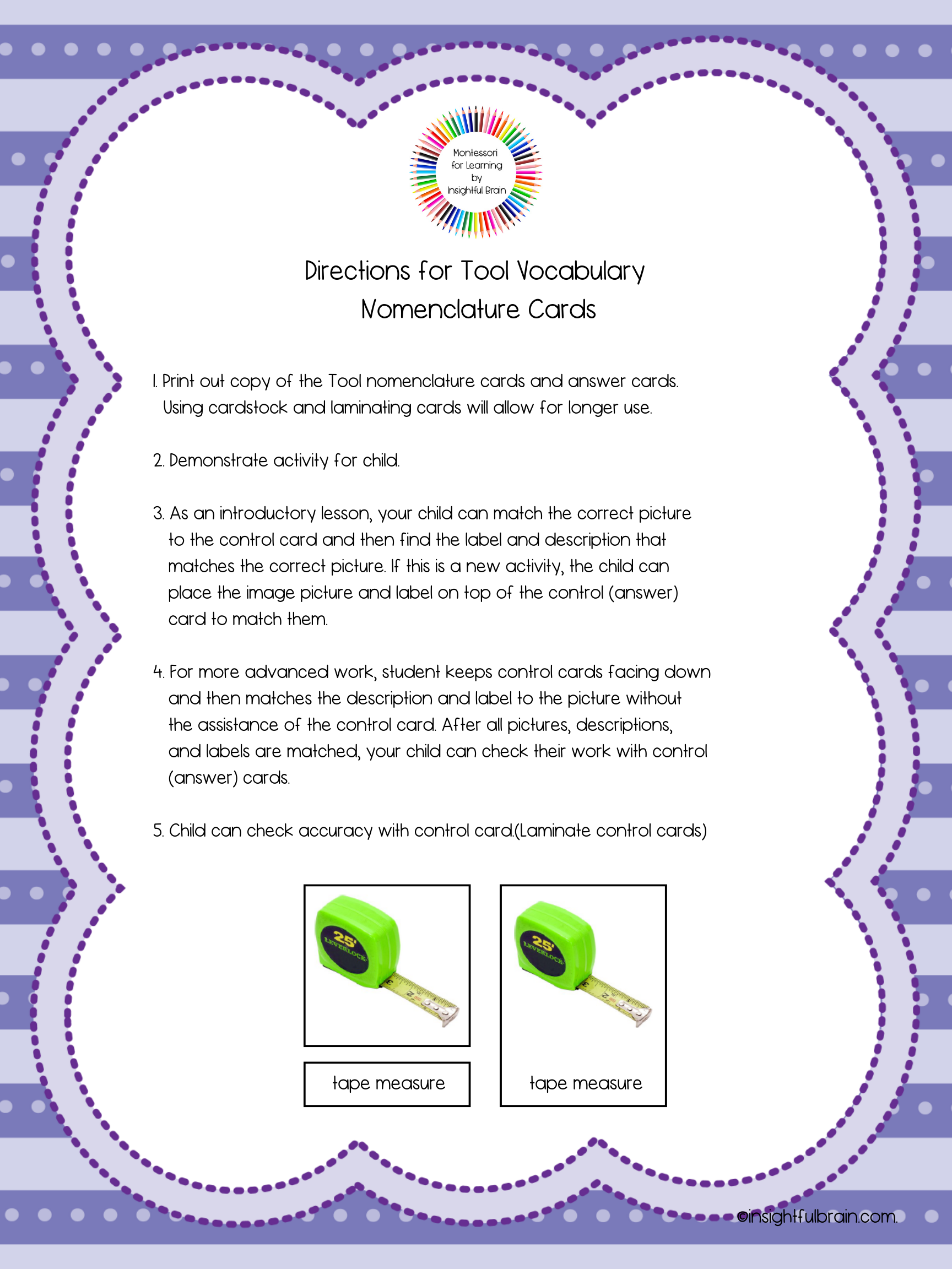 Set includes 12 tools vocabulary cards, 12 control cards, and instructions.