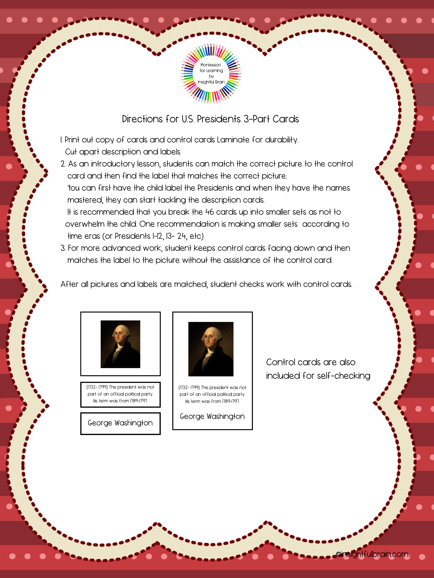 The 3-Part cards can be used for a variety of purposes: 1) learning President's names 2) Topics for research projects 3) Children can add their own index card of facts detailing major events that happened during that President's term.