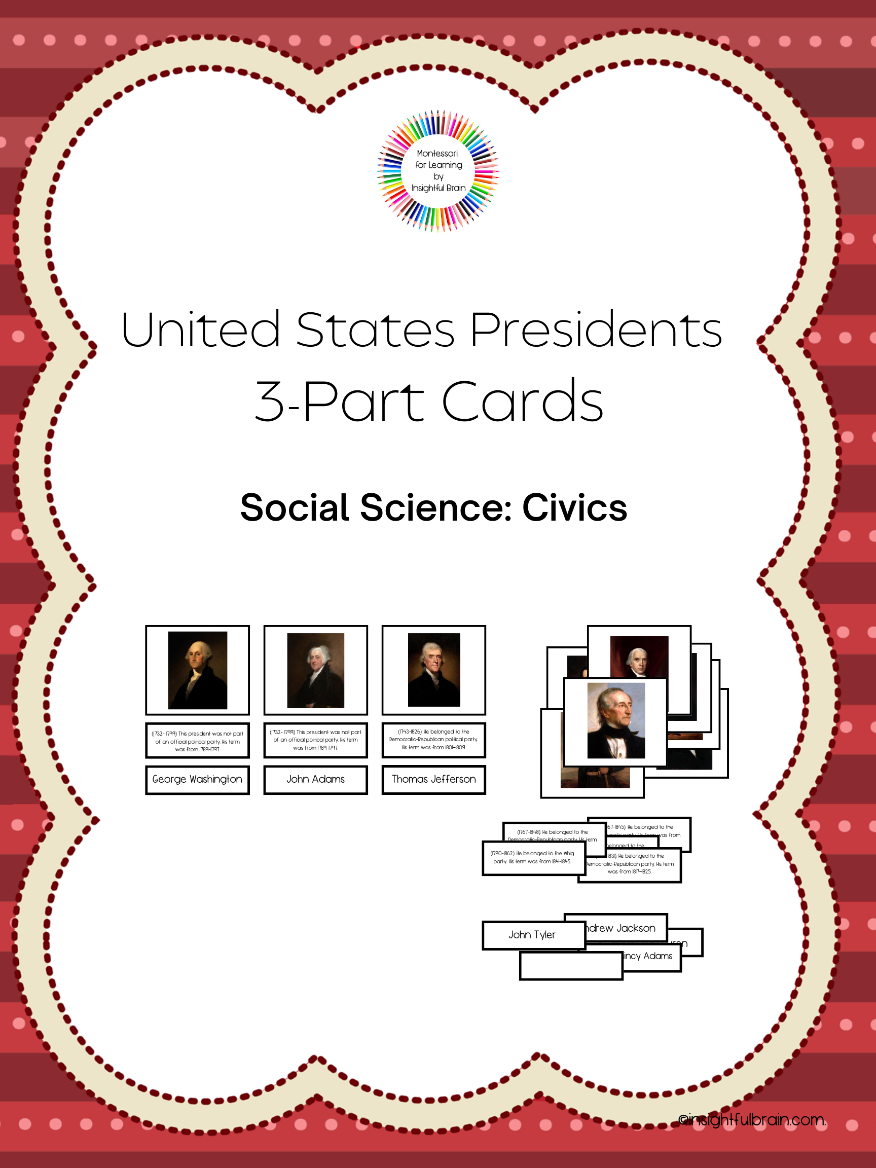 The US Presidents 3-Part cards allows children to build a good foundation in civics as they learn the names and timeframe of each US President.