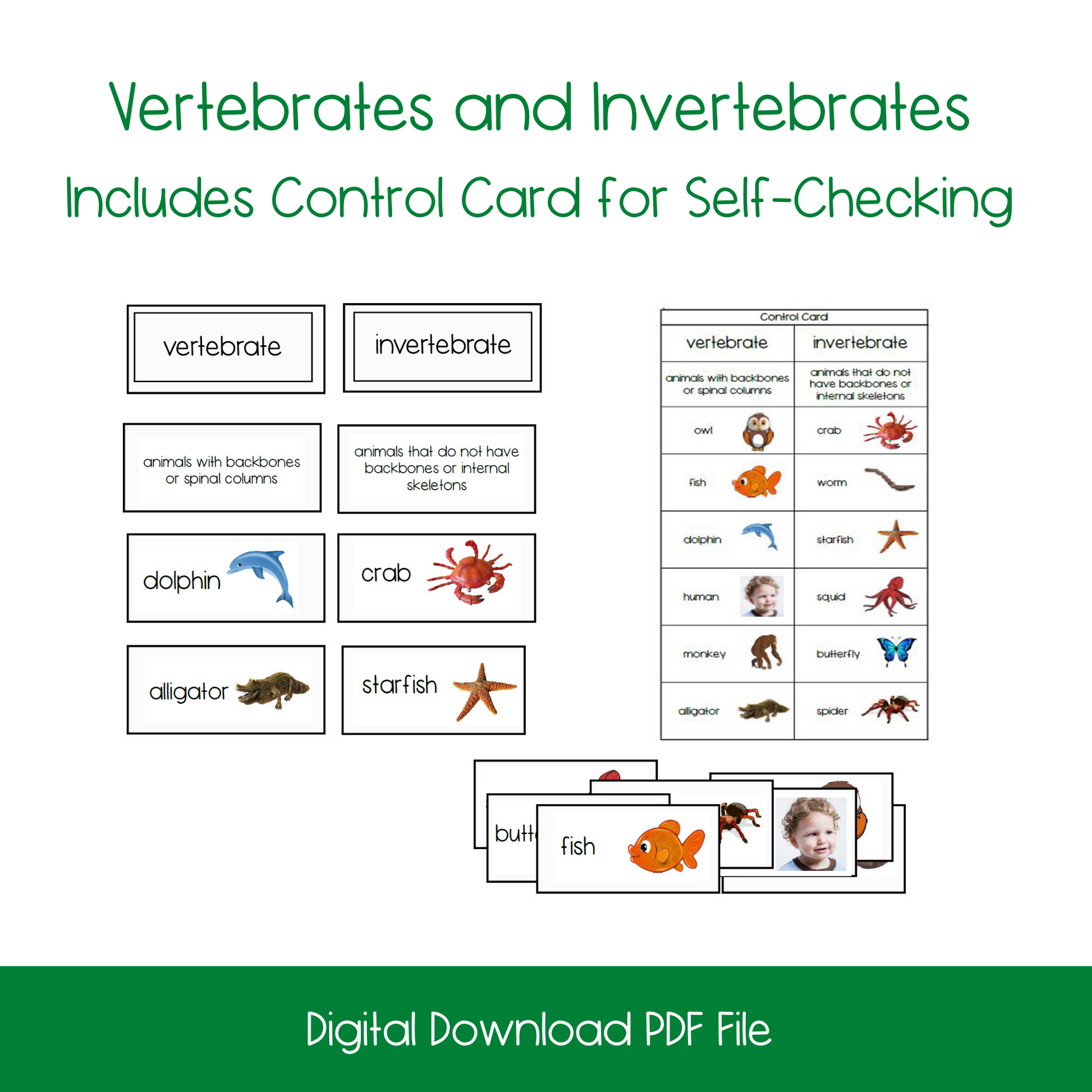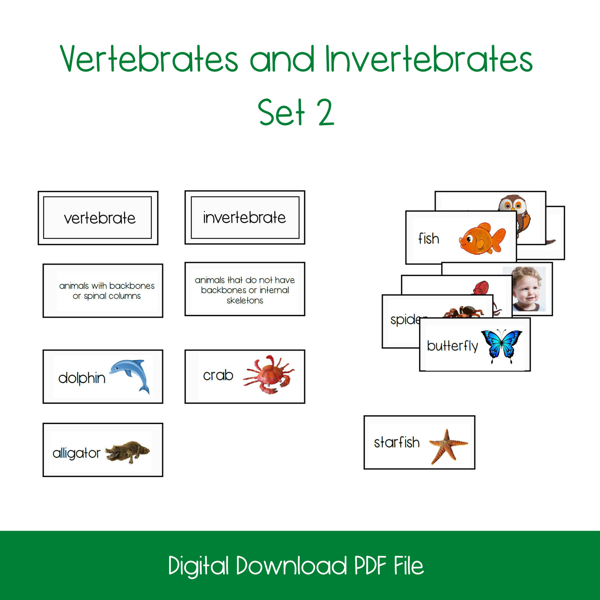 - 2 category labeling cards of Vertebrate and Invertebrate (in each set). Four total included in bundle.